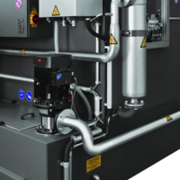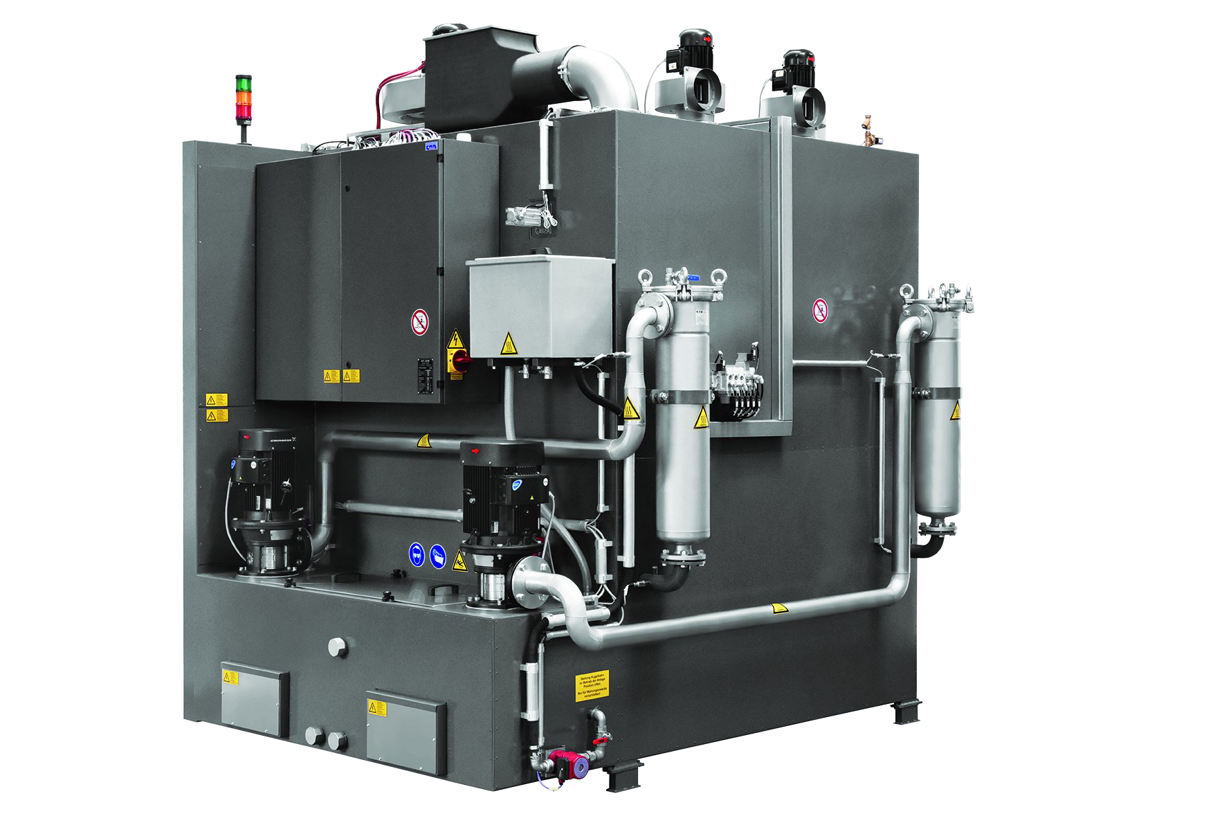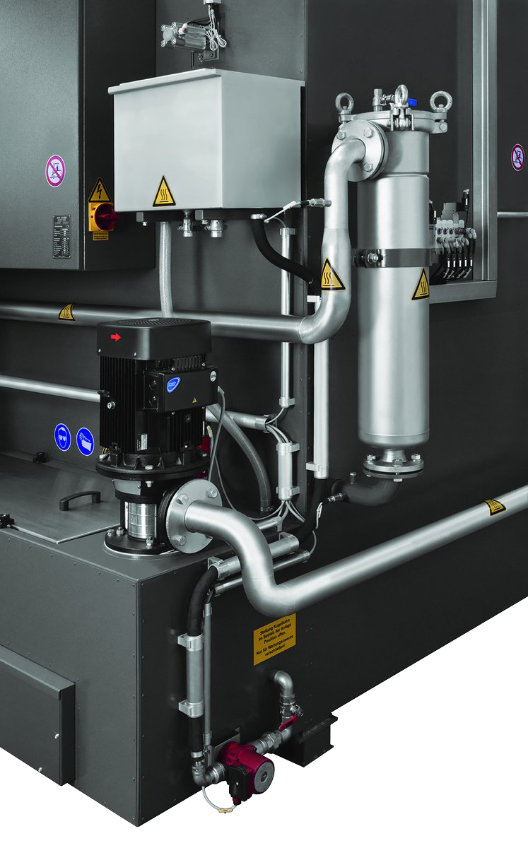 Die Gebinde rotieren während des Reinigungsvorganges horizontal in der Anlage. Dabei werden sie von drei Seiten unter hohem Druck und großem Volumenstrom mit heißem Reinigungsmedium gereinigt, gespült und anschließend heißluftgetrocknet.